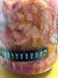 酵素ドリンクを作りました。この酵素はビール酵母と砂糖を、それからパパイヤ、パイン、オレンジ、イチゴ、ドラゴンフルーツなど21種類が入ってます。手で混ぜて自分の酵素も入れて自己免免疫力を上げます。ちなみに砂糖は化学変化して血糖や糖質が少なくなります。30度で3日間から4日間で完成します。複雑な味がしてめっちゃ美味しかったです。