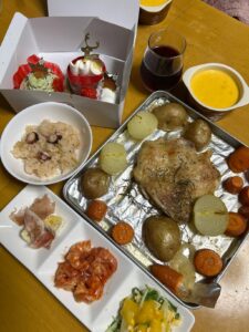 一応12月なのでそれらしきクリスマスのケーキと自家製ローストチキン、それからオードブルです。生ハムのマリネにタコピラフ、カクテルエビのサラダにホワイトアスパラのソースあえと人参と海老ビスクを作りりました。う~んやはり自分で作ると美味しさに感動しますね。